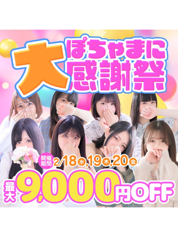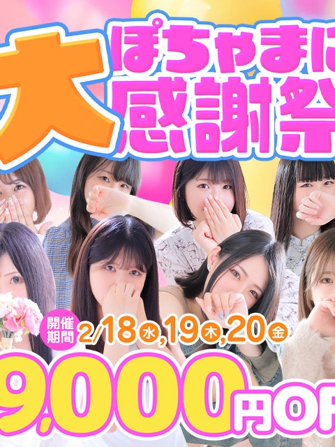 いつもぽちゃまにをご愛顧いただき、誠にありがとうございます(*´ω`*) この度、日頃の感謝を込めて【ぽちゃまに大感謝祭】を開催中です! 赤字覚悟の出血大サービス☆ 最大9,000円割引!! 【POINT.1】 2/18.19.20の3日間総額から3000円割引☆ 期間中何度でも利用可能! 【POINT.2】 イベント利用後口コミ投稿して頂いたお客様は次回も3000円割引! 【POINT.3】 期間中1度でもご利用があるお客様は2月末までの利用で次回も3000円割引! トータル9000円割引!実質60分コース1回分無料の超激得イベント☆ もちろんご新規様、本指名のお客様にもご適用させて頂きます♪ この機会に是非お遊び下さいませ!(゚∀゚) ※川越市内のみ適用 ※80分コース以上から適用 ※他イベント併用不可 ※フリー不可 ※イベント期間中複数回ご利用頂いても口コミ特典のご利用は1度きりとなります。